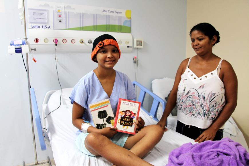 Conhecer a biblioteca também foi novidade para Maria Domingas, mãe de D.F. Para ela, o novo espaço vai ser importante durante os períodos de internação. “A leitura faz bem para ela. Tanto que ela saiu da biblioteca com um livro novo”, diz a mãe após a filha se interessar pela história de outra garota e os preparativos para a festa de 15 anos.